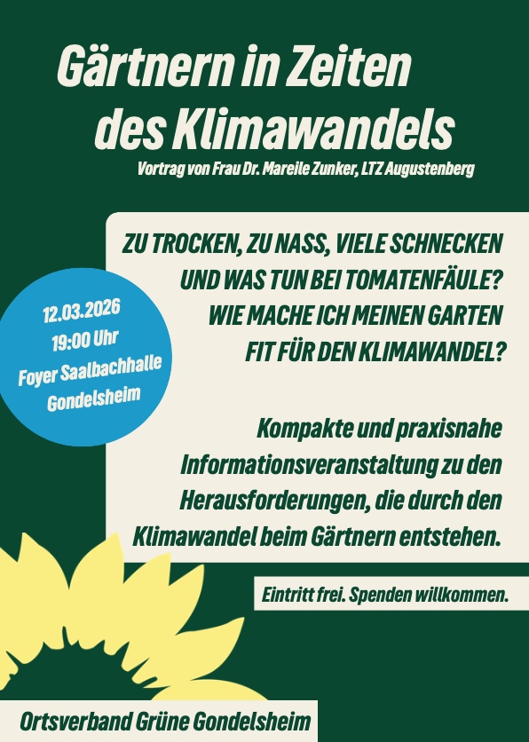 Referentin des Abends ist Frau Dr. Mareile Zunker vom Landwirtschaftliches Technologiezentrum Augustenberg. Sie kennt die konkreten Herausforderungen, die der Klimawandel für Gärten und Balkone mit sich bringt, aus erster Hand. In ihrem Vortrag gibt sie wertvolle Tipps, welche Pflanzen besonders robust sind, wie sich Gemüse und Kräuter sinnvoll kombinieren lassen und wie auch bei großer Hitze gute Bedingungen für gesundes Wachstum geschaffen werden können.