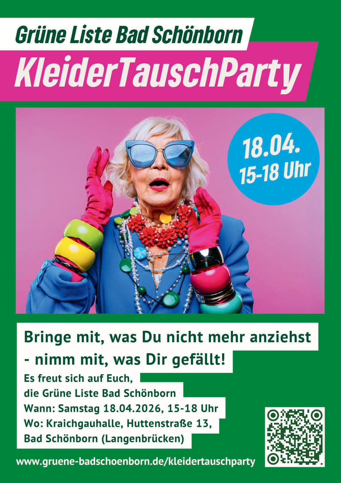 Am Samstag, den 18.04.2026 organisiert die Grüne Liste Bad Schönborn von 15 bis 18 Uhr die vierte Kleidertausch-Party. Sie findet wieder in der Kraichgauhalle in Bad Schönborn, Langenbrücken (Huttenstraße 13) statt.